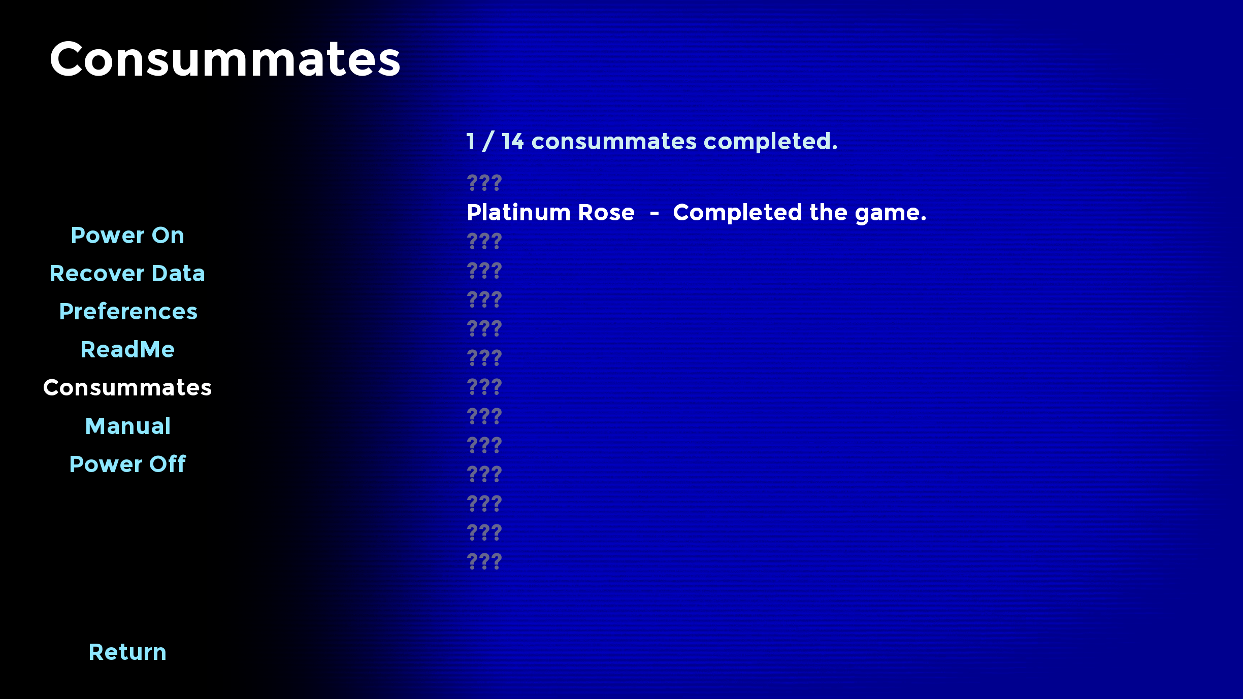 - Consummates added! These are on the menu and let the player see certain tasks they've done. For certain platforms, these will also trigger Achievements. Although the picture says 14, I currently plan on the game having 15.